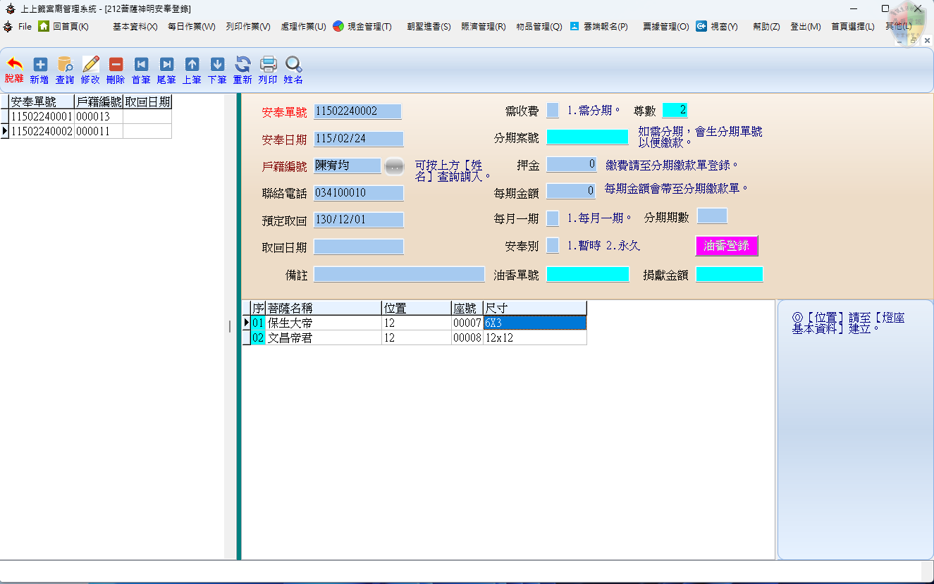執行空間位置分派: 在底部明細表格錄入神尊名稱。注意:所有的位置資料必須事先在【燈座基本資料】功能中先行建立完成,此處才可正確指定安奉位置與座號。