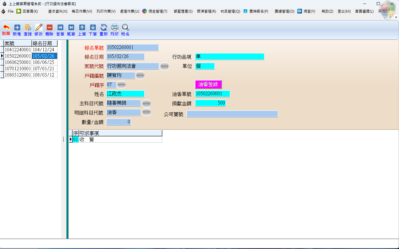 本功能的核心價值在於實現報名作業的自動化與精確化。透過調入預設的「案號代號」,系統會自動帶出對應的「行功品項」與「單位」。此機制不僅提升了櫃檯人員的錄入效率,更能確保財務科目(如:隨喜樂捐、油香)與報名單據的一致性,為後續的法會管理與財務結算提供可靠數據。