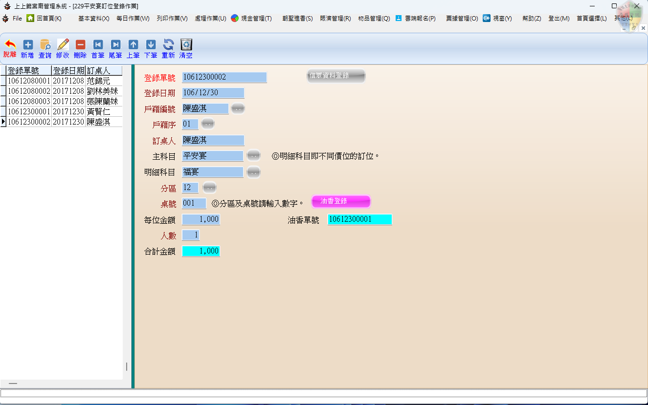 本功能的核心價值在於實現宴席管理的數位化。透過系統錄入,廟方可清楚掌握每個「分區」與「桌號」的入座率。同時,利用「每位金額」與「人數」的乘積自動產出「合計金額」,能有效簡化櫃檯收款程序並降低人工計算錯誤,確保年度平安宴的行政與帳務作業達到標準化。