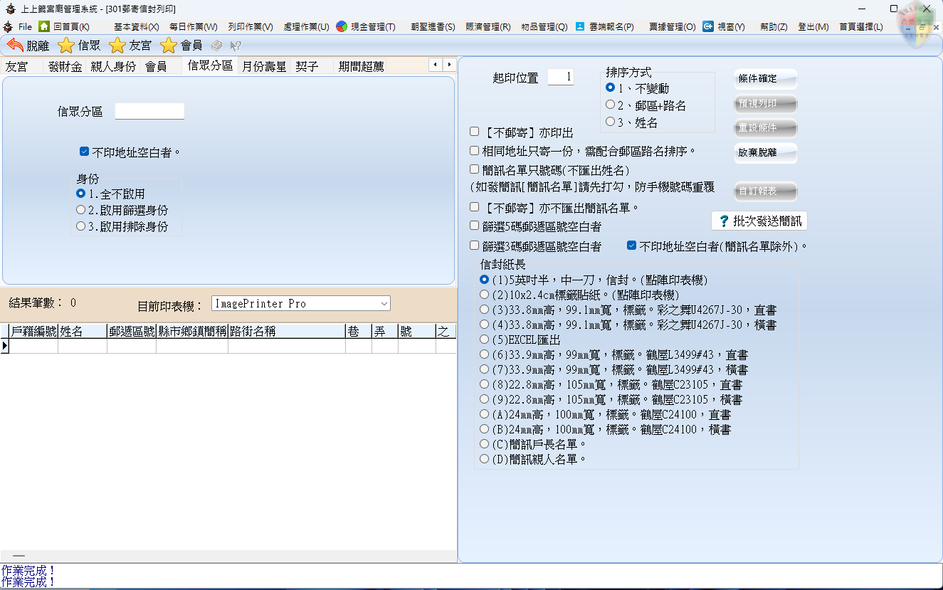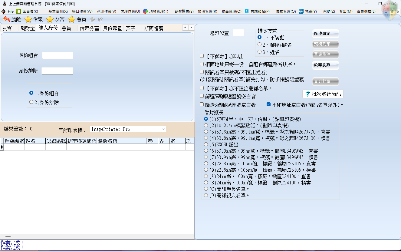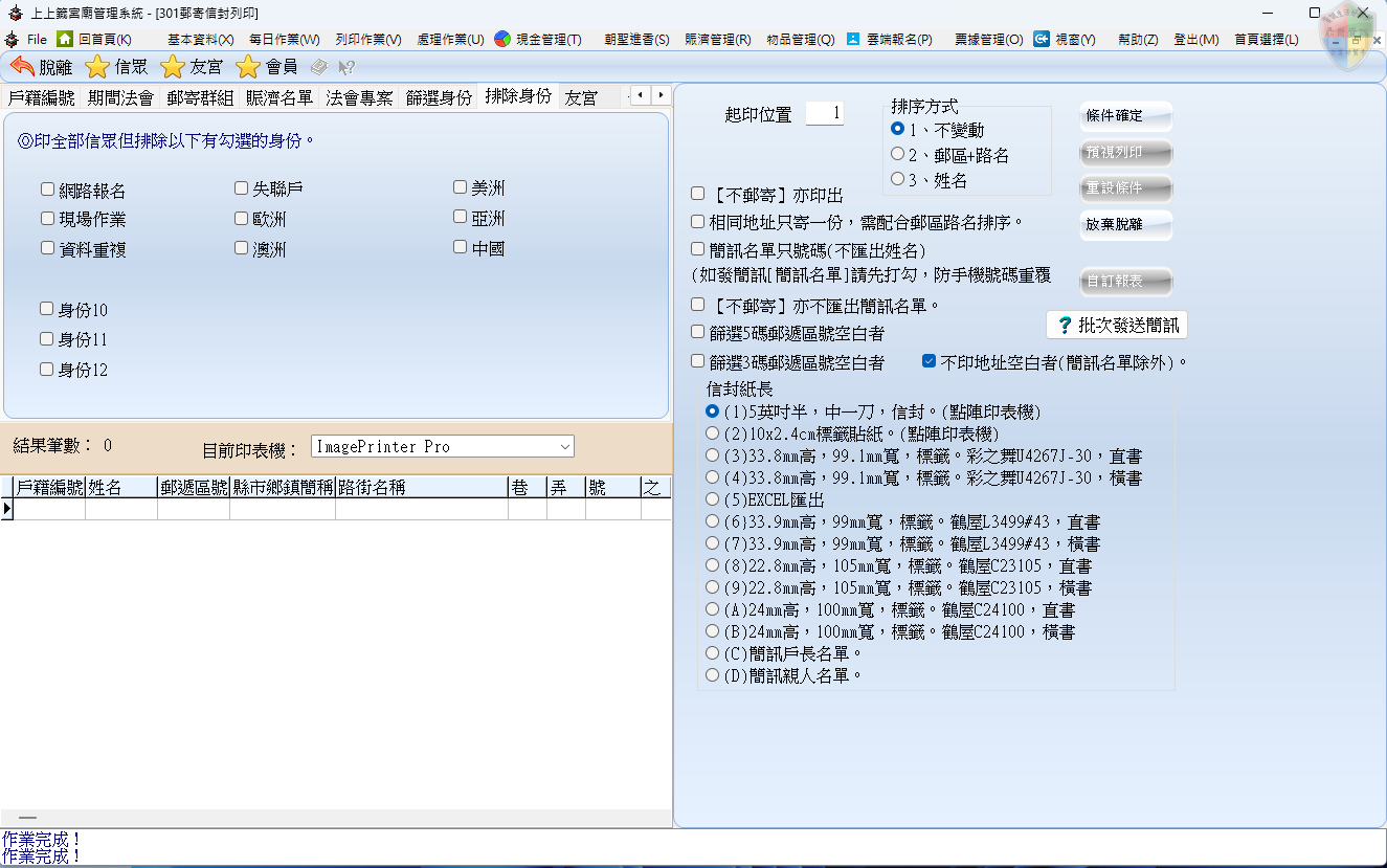排除身份: 「扣除法」篩選。在大宗列印時,可以設定扣除掉「已遷出者」、「已往生者」或「已重複領取者」,維持廟方資料的精確度。