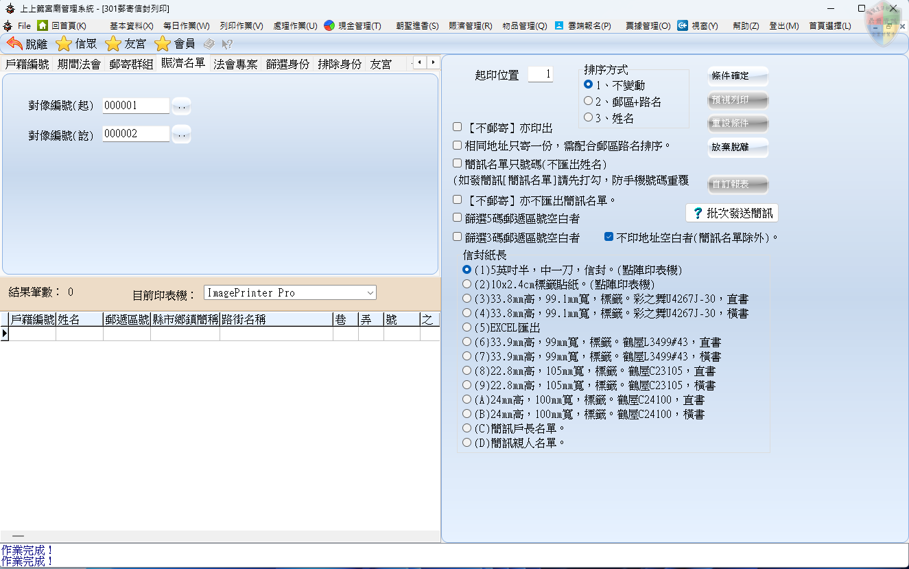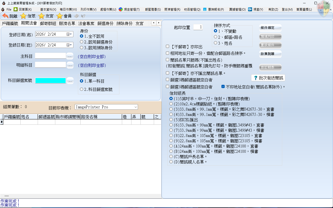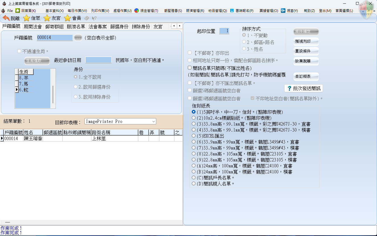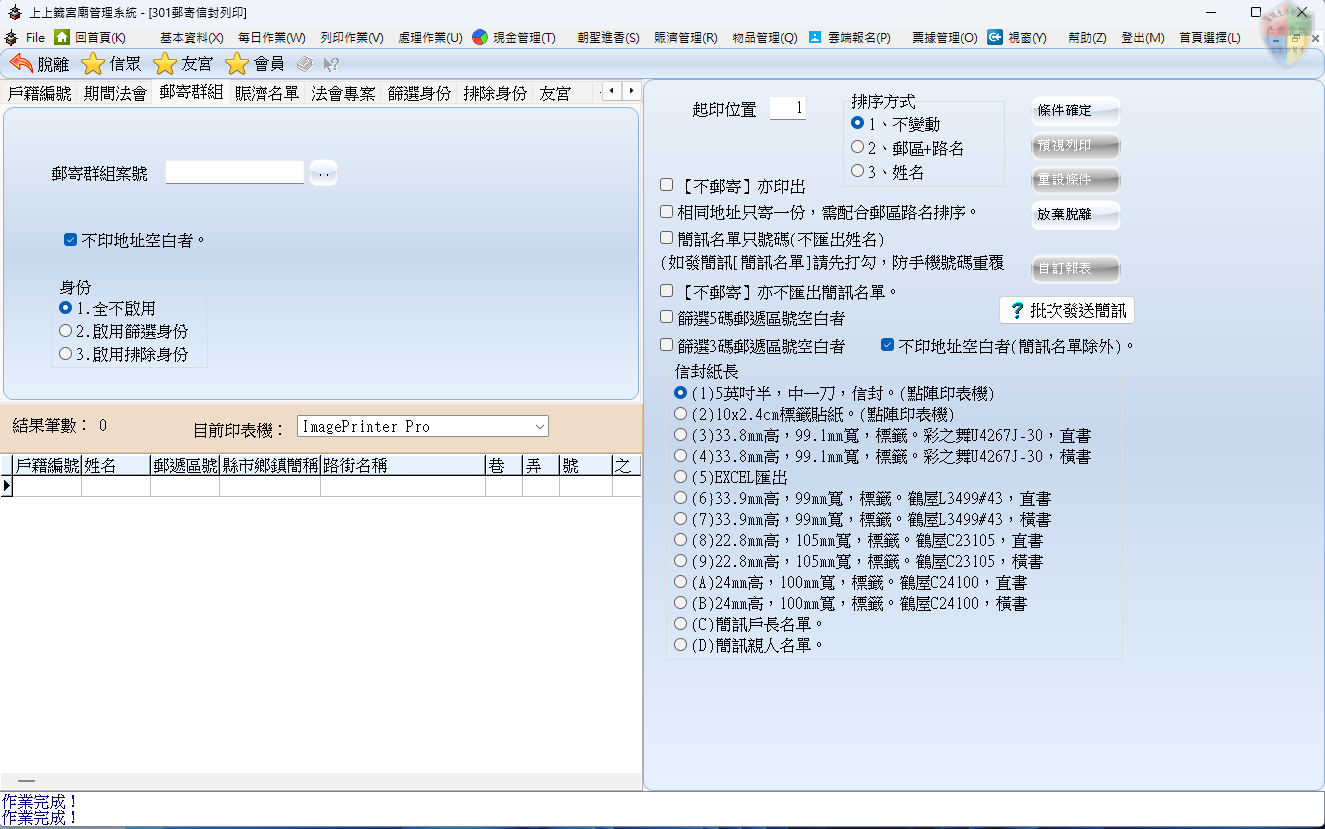 排除身份: 「扣除法」篩選。在大宗列印時,可以設定扣除掉「已遷出者」、「已往生者」或「已重複領取者」,維持廟方資料的精確度。