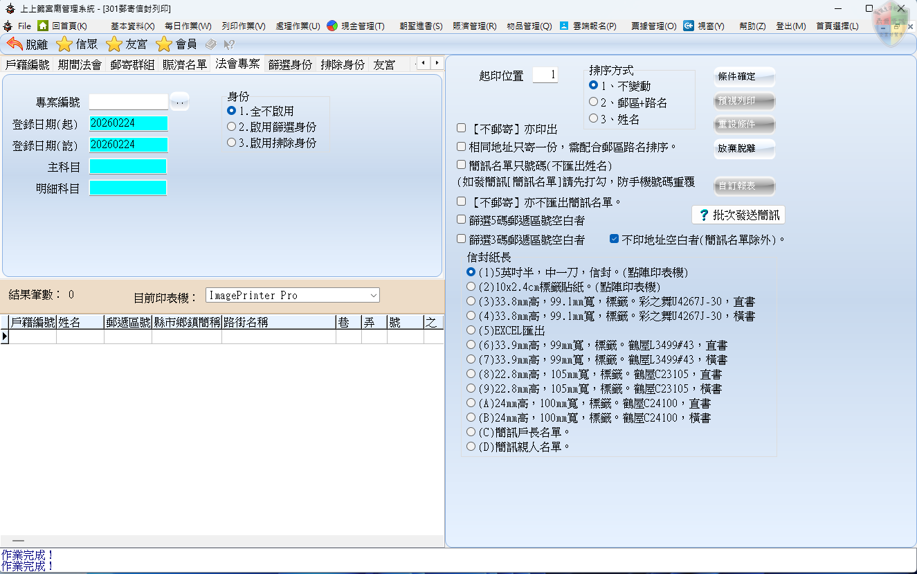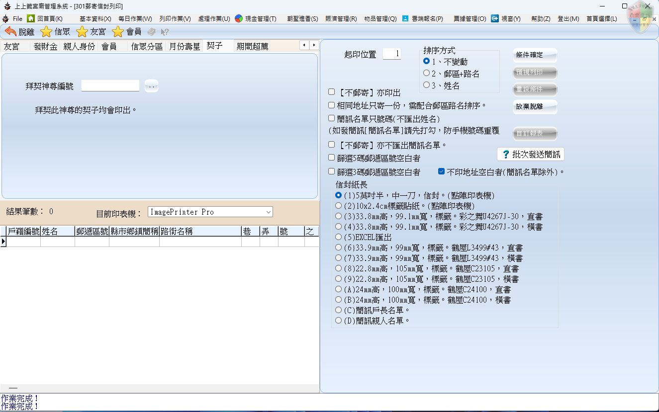 在台灣宮廟的數位行政中,郵寄是聯繫信眾感情的最重要工具。位於介面左上方藍色方框處的這排頁籤,就是決定「名單抓取邏輯」的開關。操作時,請善用左側的 「 < > 」方向切換鍵,在 15 個分頁中選取正確的業務項目: