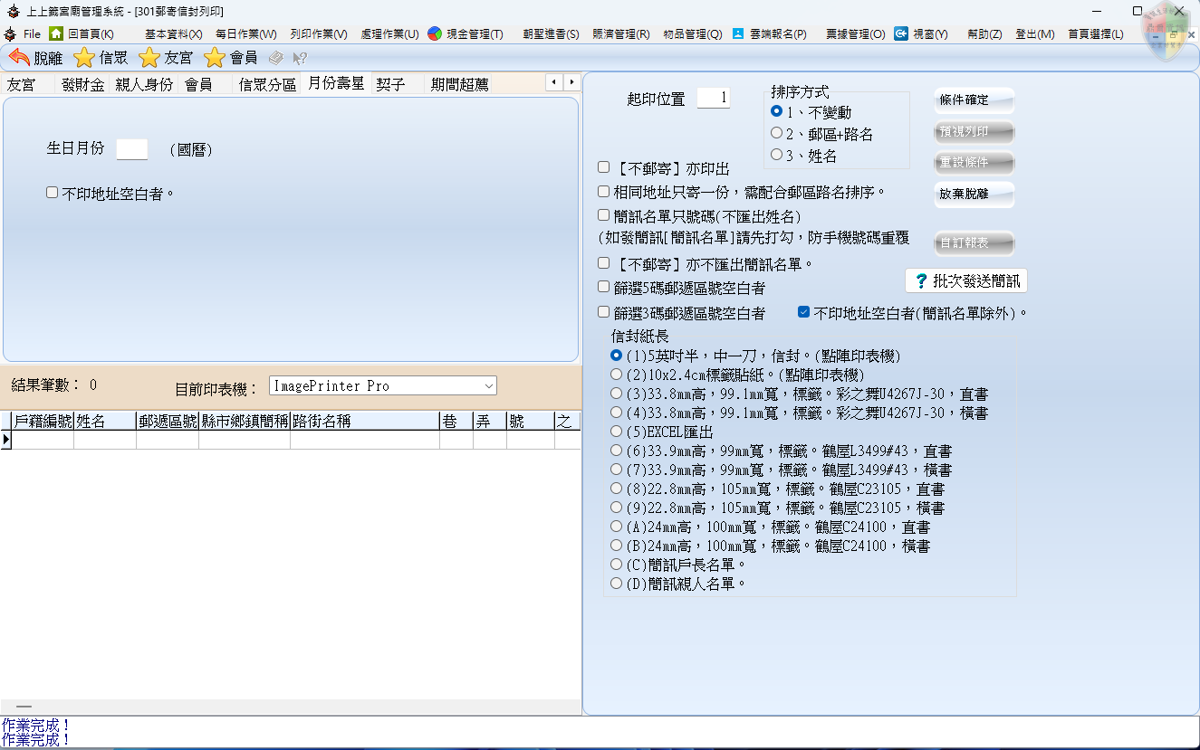 月份壽星: 精緻化關懷。系統會根據當月日期,自動撈出所有「當月生日」的信眾,方便廟方寄送生日賀卡、祝壽卡或壽星專屬的點燈優惠。