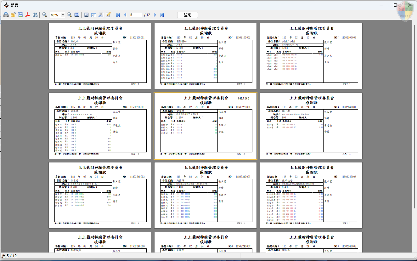 系統具備強大的資料連動性,能根據選定的「案號」自動帶出所屬的信眾名單、捐獻金額及家戶成員資訊。這對於大型法會期間,動輒數百甚至上千筆的報名資料,提供了極為便利的一鍵式解決方案。行政人員不需逐筆查詢,即可透過設定「起訖單號」或「日期區間」完成所有憑證的自動化排版與產出。