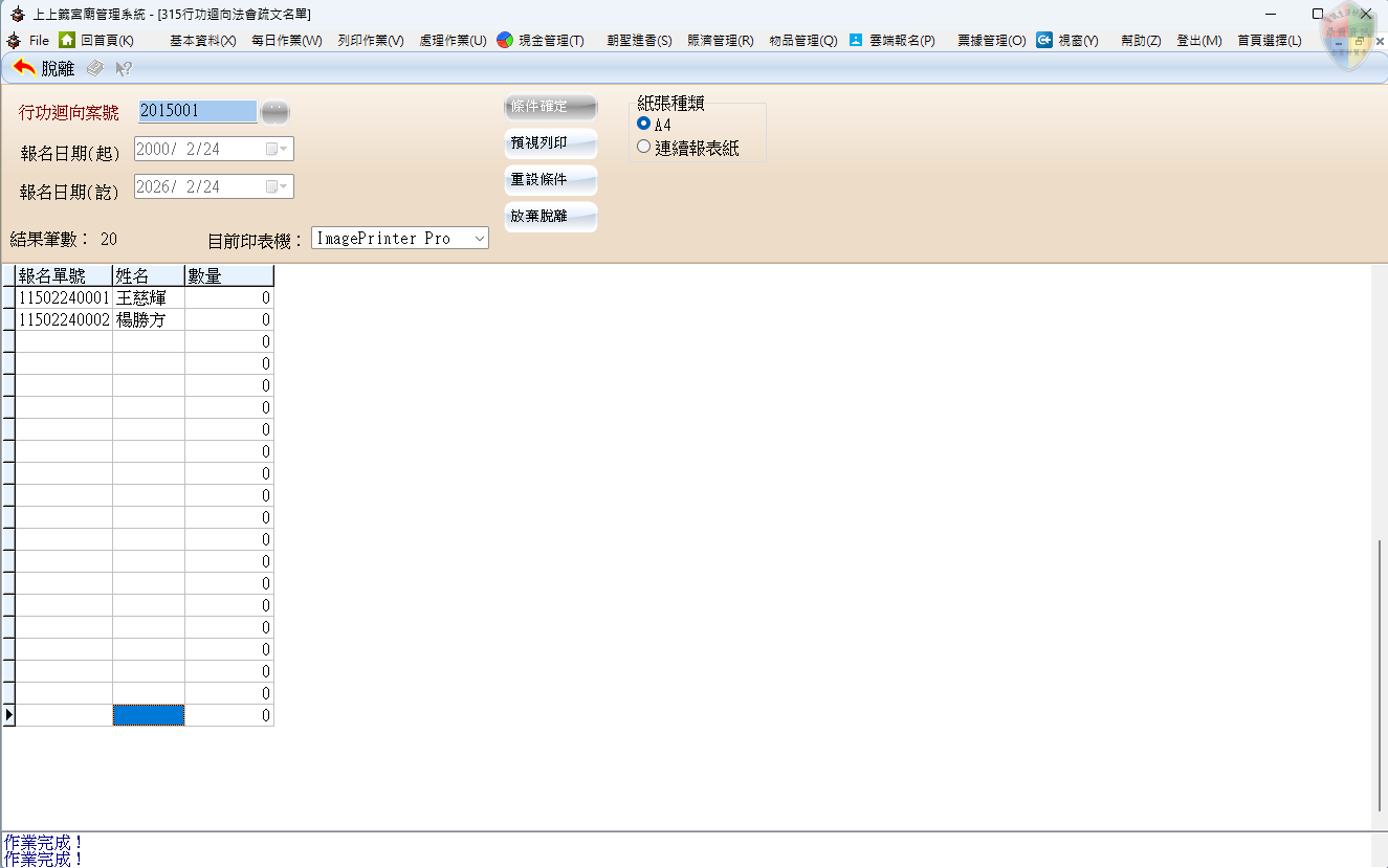 系統採取「案號篩選」與「日期篩選」雙軌檢索邏輯。行政人員可以針對特定大型功德法會案號進行全量產出,亦可依據特定的登錄日期區間篩選出單日新增的報名紀錄。系統會自動擷取信眾姓名、受薦類別、歲次、生肖及生辰,達成行政帳務資料與宗教祭祀需求的高度整合,確保法會宣讀時的功德名單無誤。