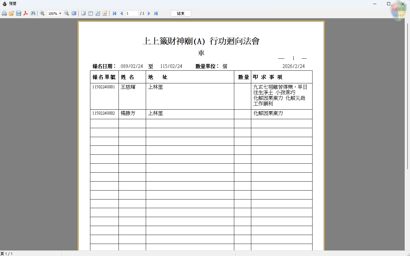 列印作業 > 行功迴向法會疏文名單