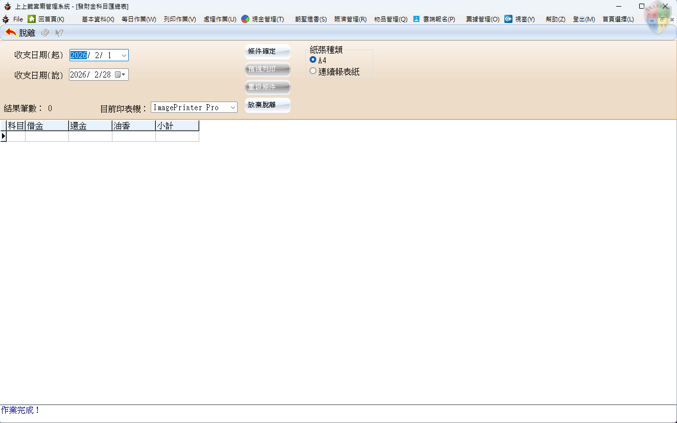 本模組為針對發財金相關帳務設計的會計彙算報表。與明細表不同,匯總表將特定期間內的所有求金、還金與轉帳紀錄,依照「會計科目」進行總額加總。這能協助宮廟財務管理者快速掌握發財金整體的收入與支出結構。