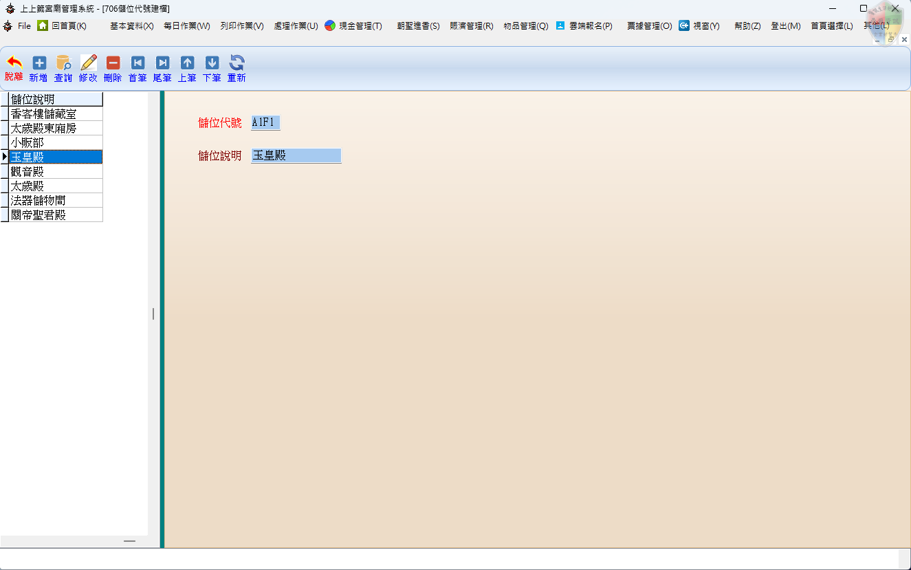 本功能主要用於管理宮廟內部的儲位空間,透過定義明確的「儲位代號」與「儲位說明」,協助管理人員快速辨識並定位物品的存放區域。