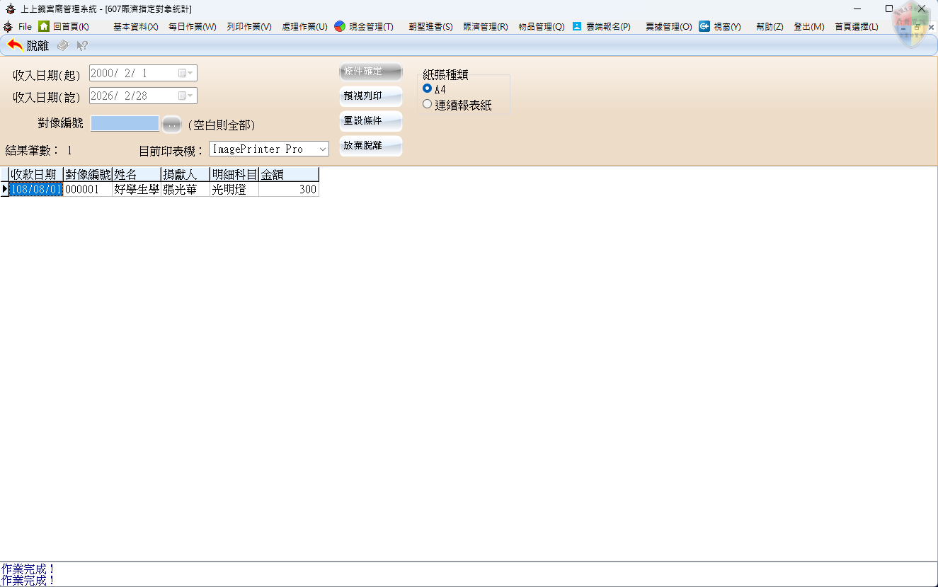 本模組為宮廟慈善賑濟作業的分析與報表中心。當需要針對特定條件(如指定身分別、特定區域或特定慈善專案)的受助對象進行篩選與統計時,此功能可快速彙總資料,產出精確的賑濟名單。這不僅利於行政人員進行資源分配的決策分析,亦可作為向理監事會報告慈善支出績效或產出年度救濟統計表的關鍵依據。