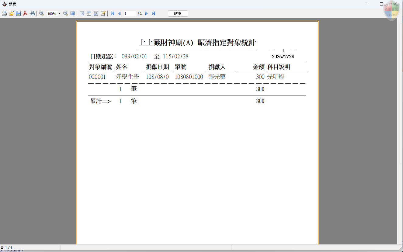 本模組為宮廟財務與善款管理的重要報表工具。用於彙整特定「日期區間」內,所有參與慈善賑濟或捐獻活動的信眾名單及其捐款明細。透過此報表,管理人員能清楚掌握賑濟資金的來源流向,並作為對外徵信(如:公告芳名錄)或對內帳務稽核的關鍵基礎,確保慈善帳目的公開透明與嚴謹性。