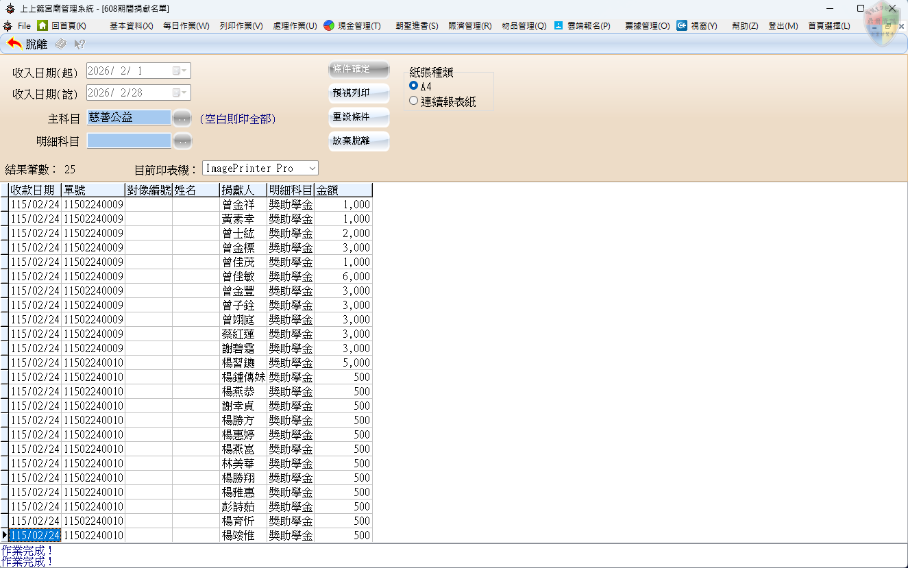查詢列表:點擊 【條件確定】 後,系統會列出該區間內所有捐獻者的基本資料(姓名、地址)、捐獻項目、金額及日期。