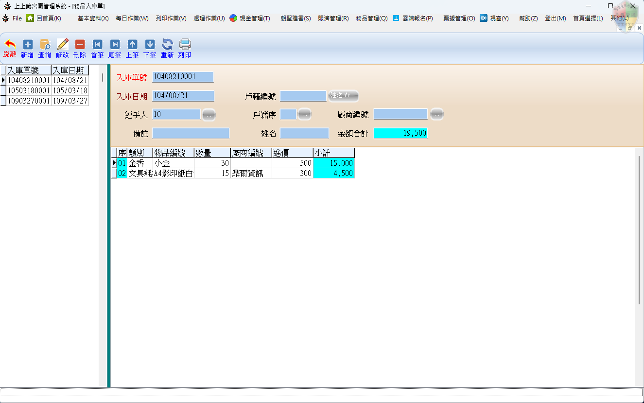 本模組用於管理宮廟內部物品的採購與入庫作業。透過此功能,管理人員能將採購進來的物品正式登錄至系統庫存,確保庫存帳務與實體物品數量一致。每張入庫單可記錄多項物品的入庫數量、進價及供應廠商資訊,並自動計算總金額,是掌握廟務物資成本的關鍵工具。