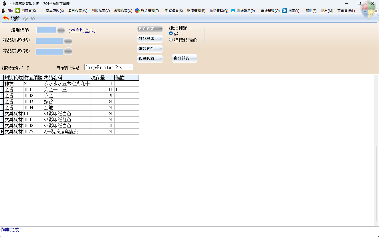 情境演練:每逢大型祭祀前夕(如農曆春節或聖誕千秋),管理人員可利用本功能快速調閱「金香類」庫存。若發現「大金」或「線香」低於安全庫存水準,即可依據「現存量表」自動生成的數據,立即啟動採購流程,確保活動無虞。