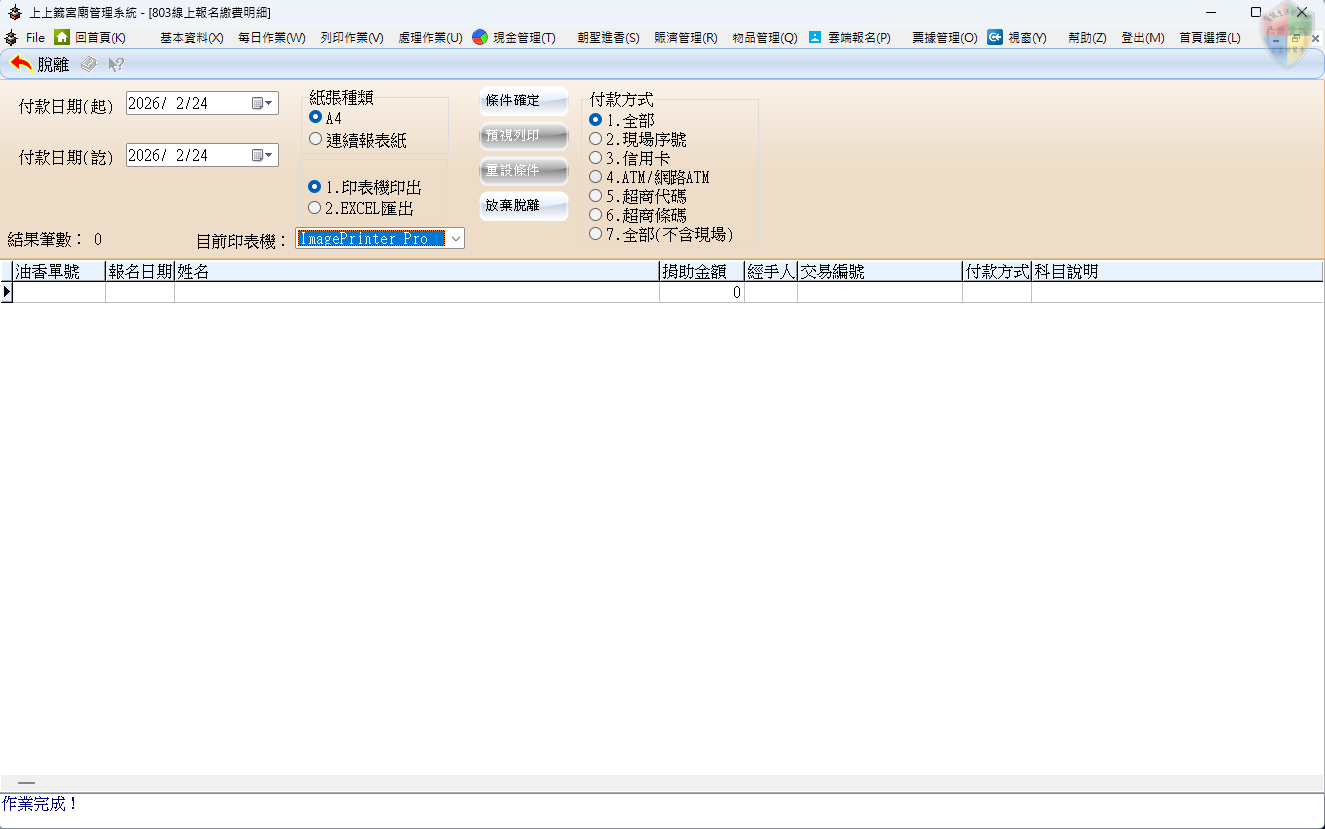 隨著雲端服務與數位支付的普及,宮廟行政需具備更強大的數據稽核能力。「線上報名繳費明細」模組是串接雲端服務與財務管理的核心橋樑。本功能的願景在於提供一個即時、透明且多維度的財務對帳平台。透過整合不同管道(如超商、代碼、信用卡等)的繳費數據,廟方行政人員能精確掌握每一筆捐助金的入帳狀態,確保線上報名與實際收支數據完全吻合,藉此大幅降低人工對帳的失誤風險,提升信眾對宮廟數位化服務的信任感與管理效能。