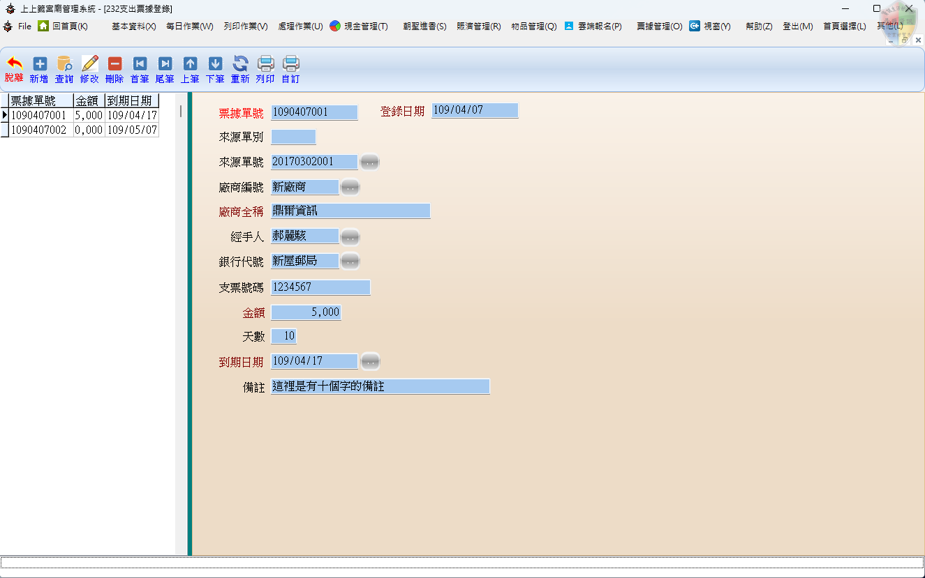 情境演練:廟方委託「鼎爾資訊」維護宮廟管理系統,需開立一張 5,000 元的支票。行政人員登錄票據後,將到期日設定為 109/04/17。透過本模組,財務主管在四月初進行資金排程時,便能預先看到這筆支出,並確保對應的銀行帳戶有足夠餘額供廠商領取款項。
