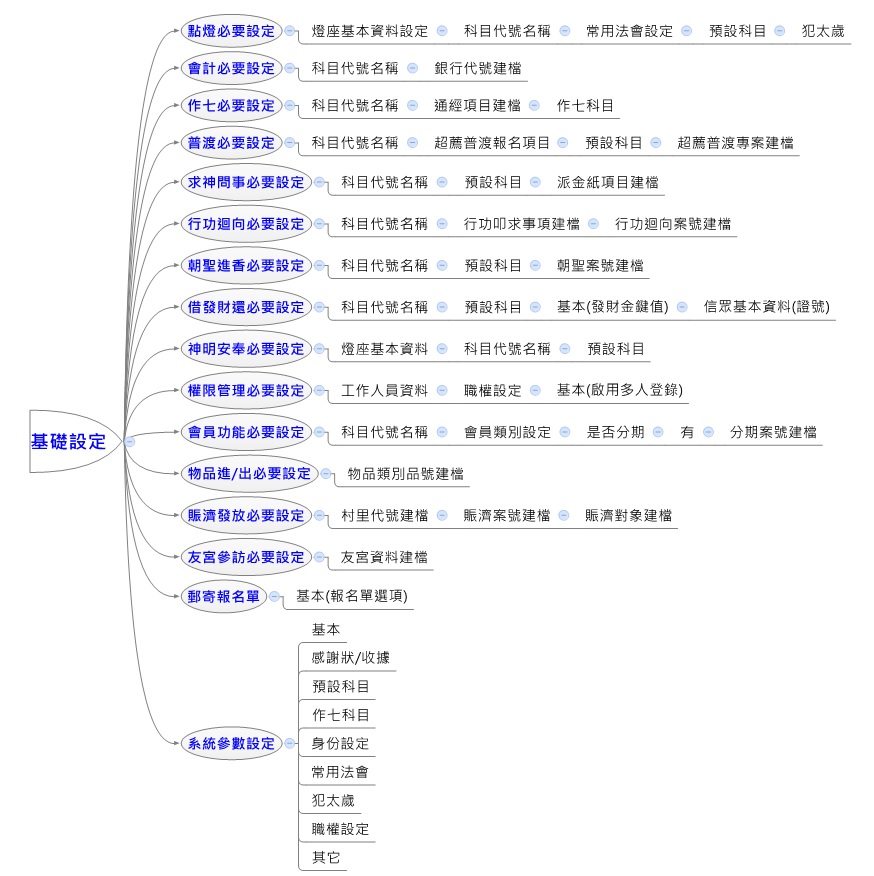 | 點燈 | 燈座基本資料設定、科目代號名稱、常用法會設定、預設科目、犯太歲 | 建立所有光明燈、太歲燈的座位配置、會計科目及相關法會資料。 |