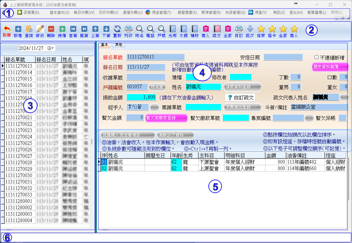 「傳承宮廟管理系統」程式功能分區說明,這裡以「油香法會登錄」為例,其它操作頁面的介面大致相同。