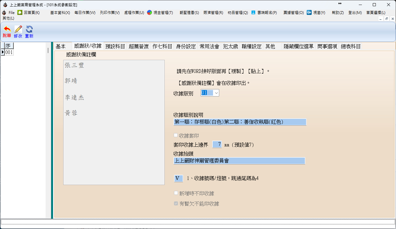 收據抬頭:設定收據上顯示的宮廟正式全銜(如:上上籤財神廟管理委員會)。