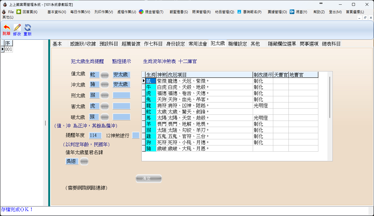 專業服務提醒:正確設定「制改提示」後,當櫃檯人員輸入信眾資料,系統會自動跳出「此人今年犯五鬼,建議制化」等訊息,能大幅提升服務的專業度與宮廟法事報名量。