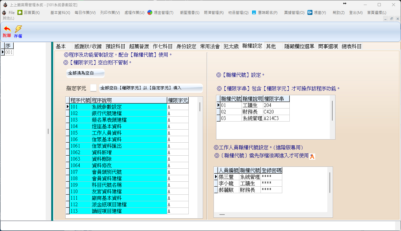 職務代號 / 職務說明:定義宮廟內的職稱(例如:01 工讀生、02 財務長、03 系統管理)。
