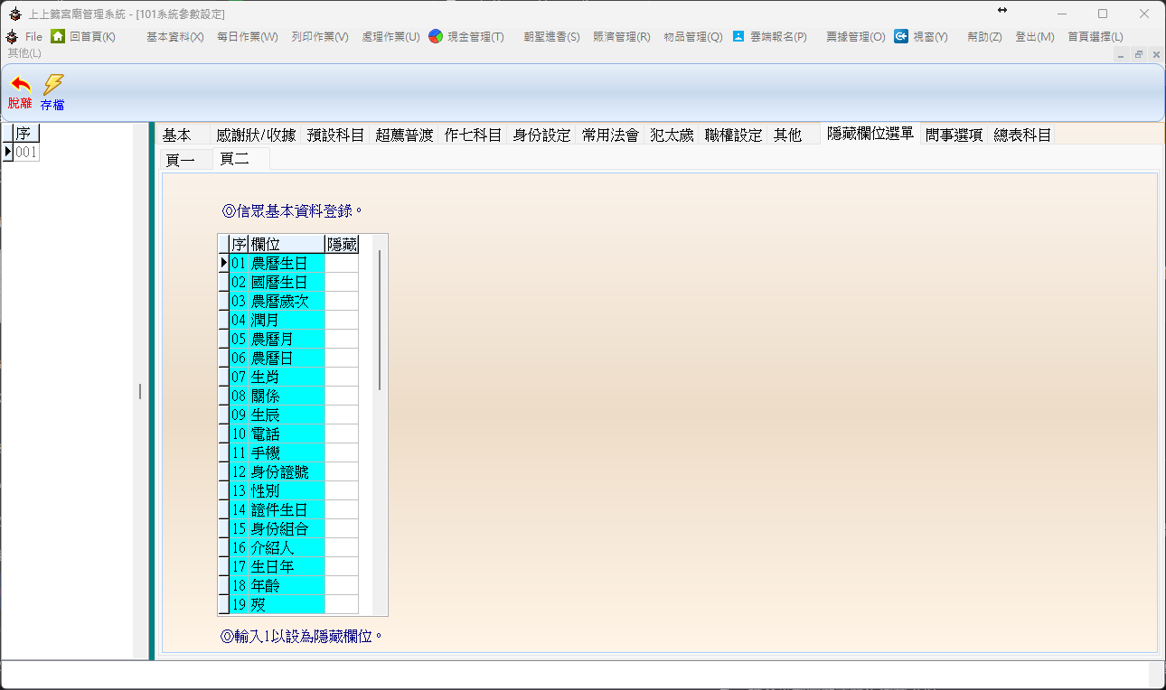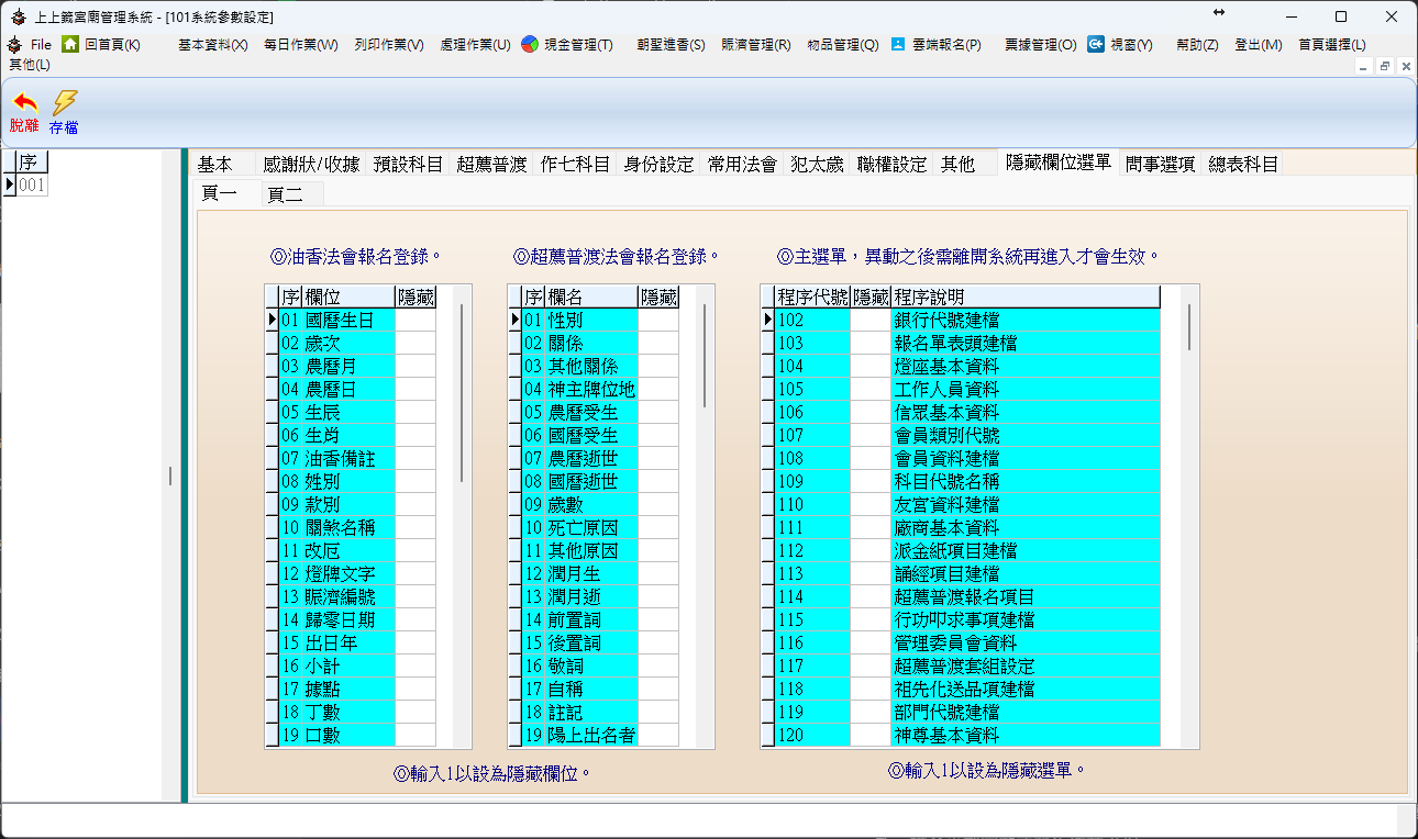 這份說明將針對 「101 系統參數設定」 中的 「隱藏欄位選單」 頁籤進行詳細解析。此功能是系統的「介面自定義工具」,允許管理者透過輸入指定數值,將不必要的選單項目或資料輸入欄位進行隱藏,以簡化介面並符合宮廟實際的作業流程。
