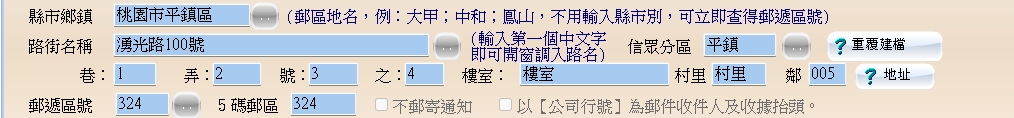 自訂地址:220個中文字 - 當輸入到對應欄位數字(鄰、巷、弄、號、之)在報表輸出時自動轉換為大寫數字.