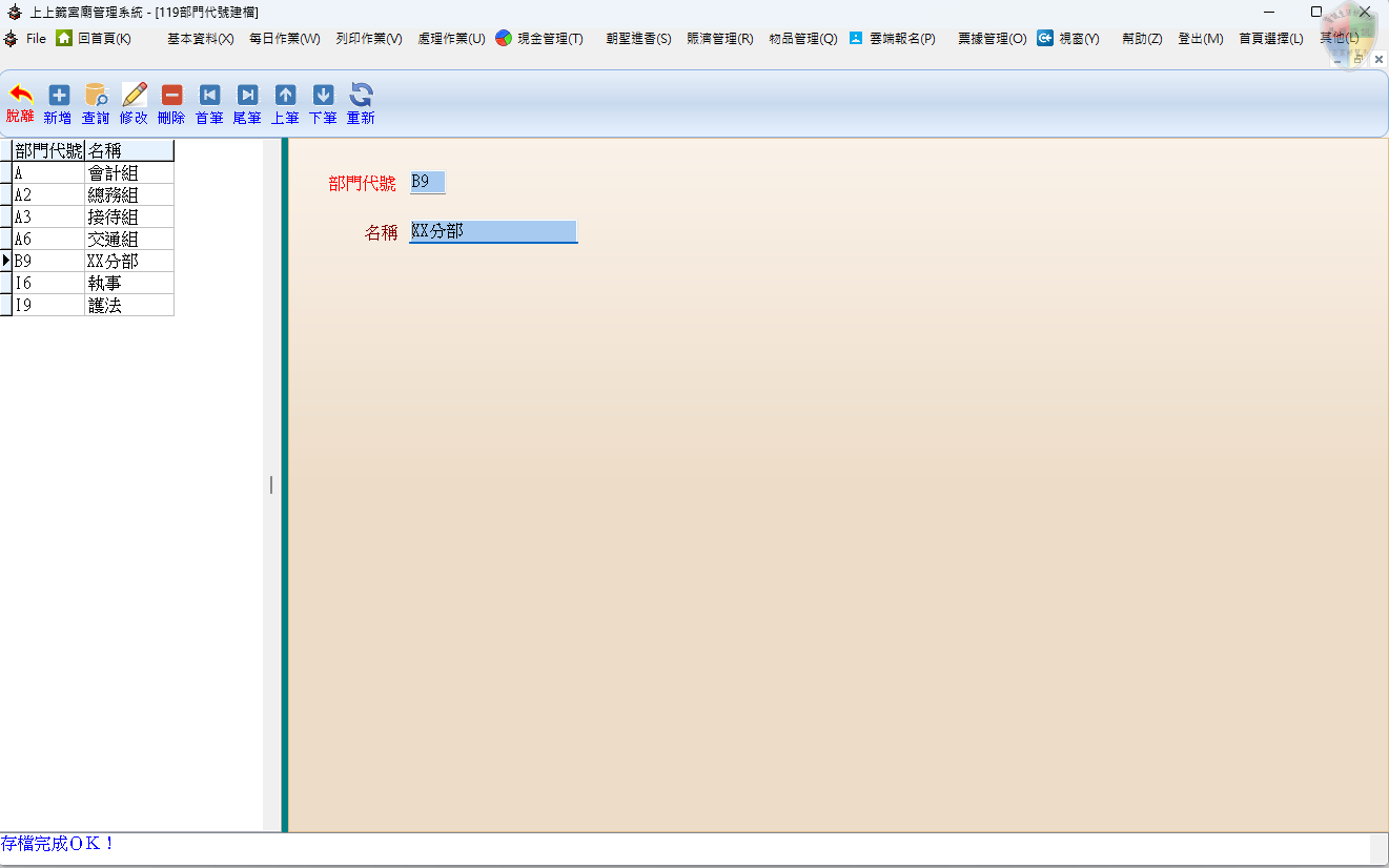 [ 刪除 ]:移除該部門資料(注意:若該部門已有關聯資料,建議不要輕易刪除)。
