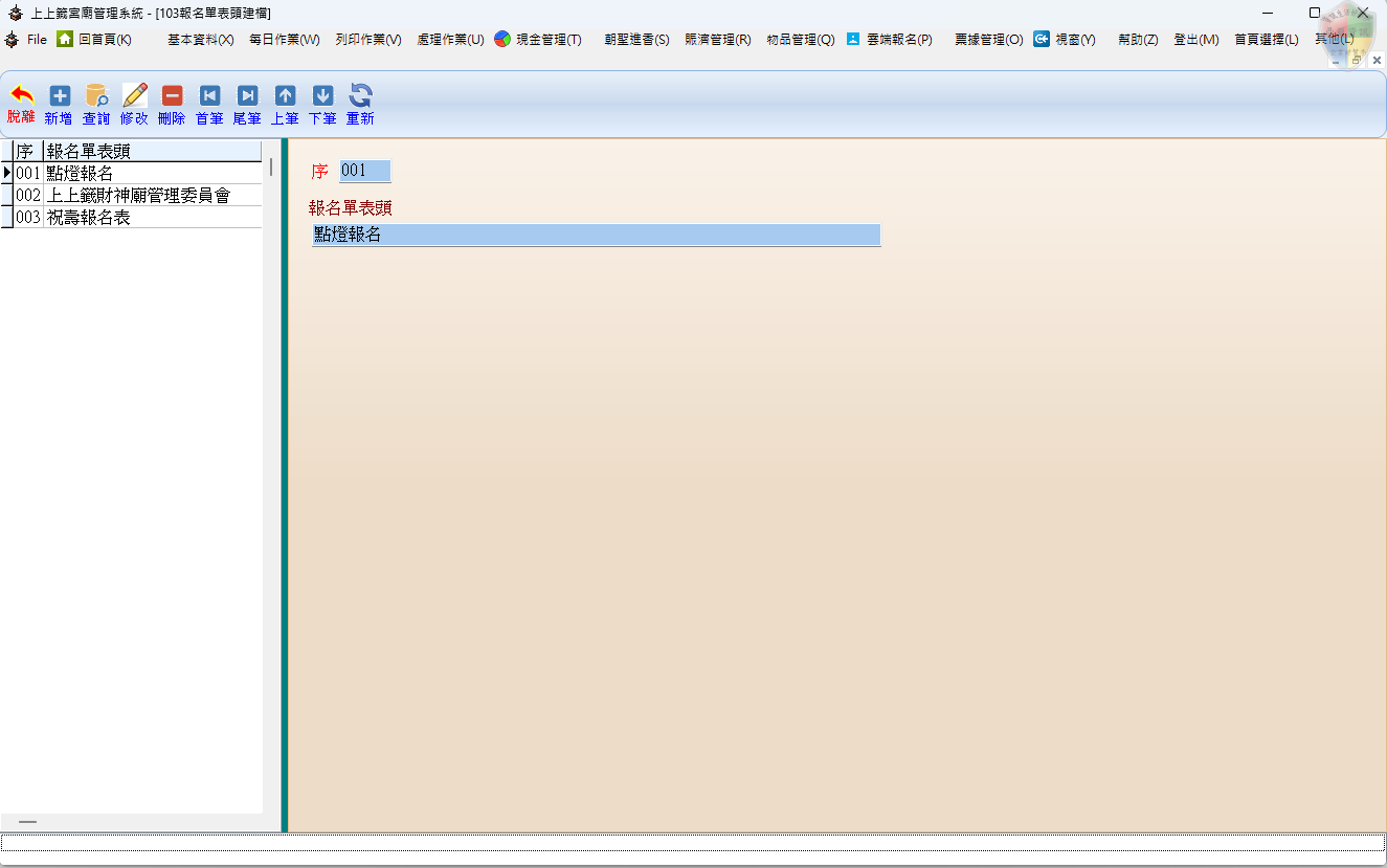 此功能用於設定各類報名表、收據或單據最上方的正式名稱(抬頭)。正確建檔後,列印出的單據才會顯示清楚的標題,方便信眾識別。