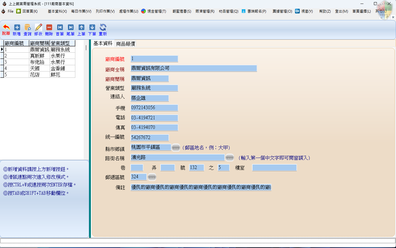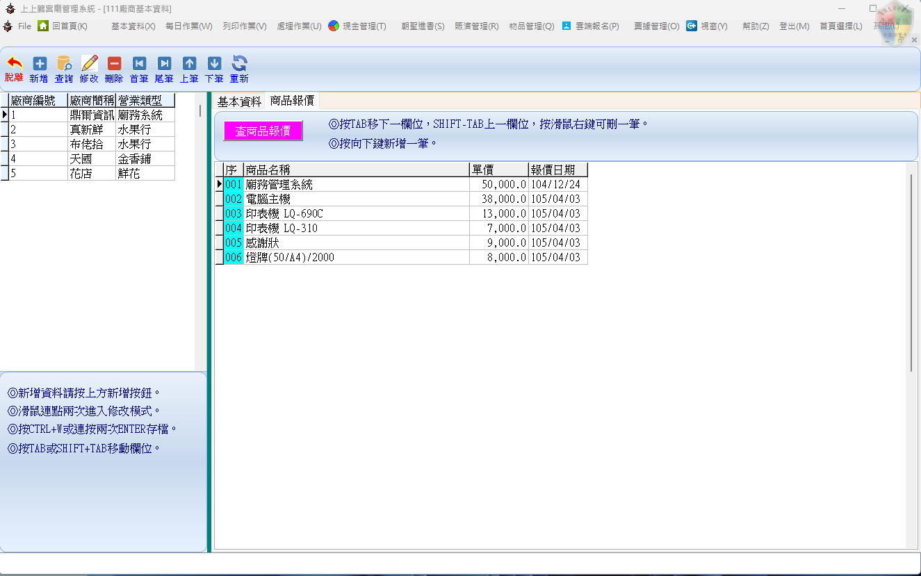 TAB或SHIFT+TAB移動欄位;利用工具列的 [ 首筆 ]、[ 尾筆 ]、[ 上筆 ]、[ 下筆 ] 翻閱廠商資料。