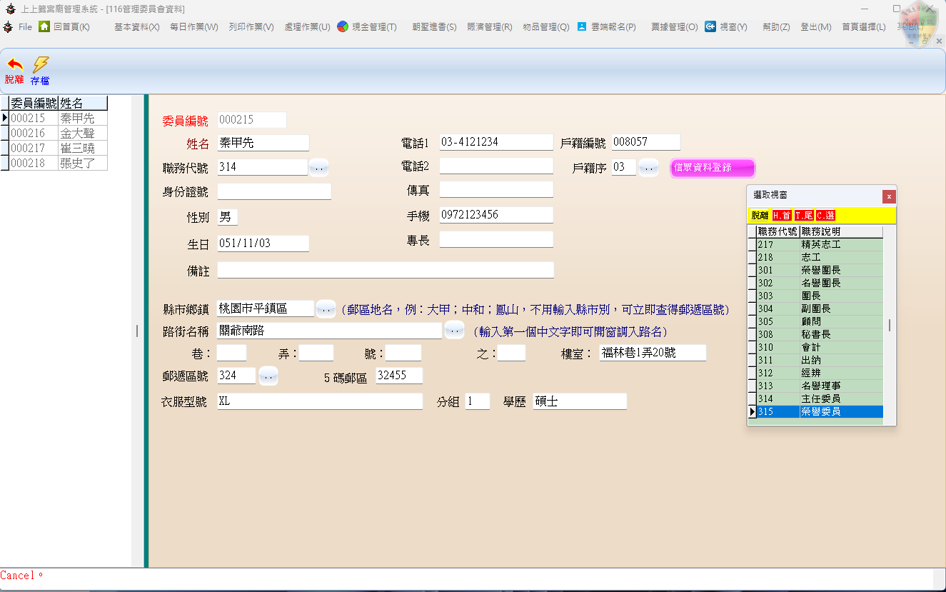 本功能用於管理宮廟管理委員會(或董事會、志工組織)的人員檔案。除了記錄基本的聯絡資訊外,核心功能在於定義每位成員的「職務代號」,並可連結至「信眾基本資料」以整合戶籍與通訊資訊。