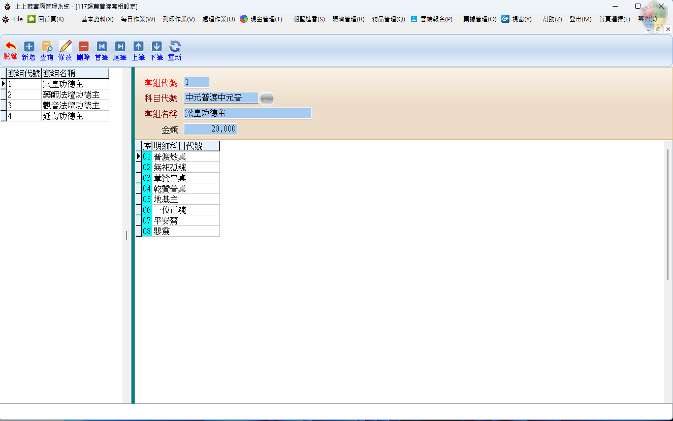 代號: 此為系統識別該事項的唯一編號。建議依據事項分類進行編號(如 01 代表消災類、02 代表祈福類),方便前台人員在繁忙時快速記憶與盲測輸入。