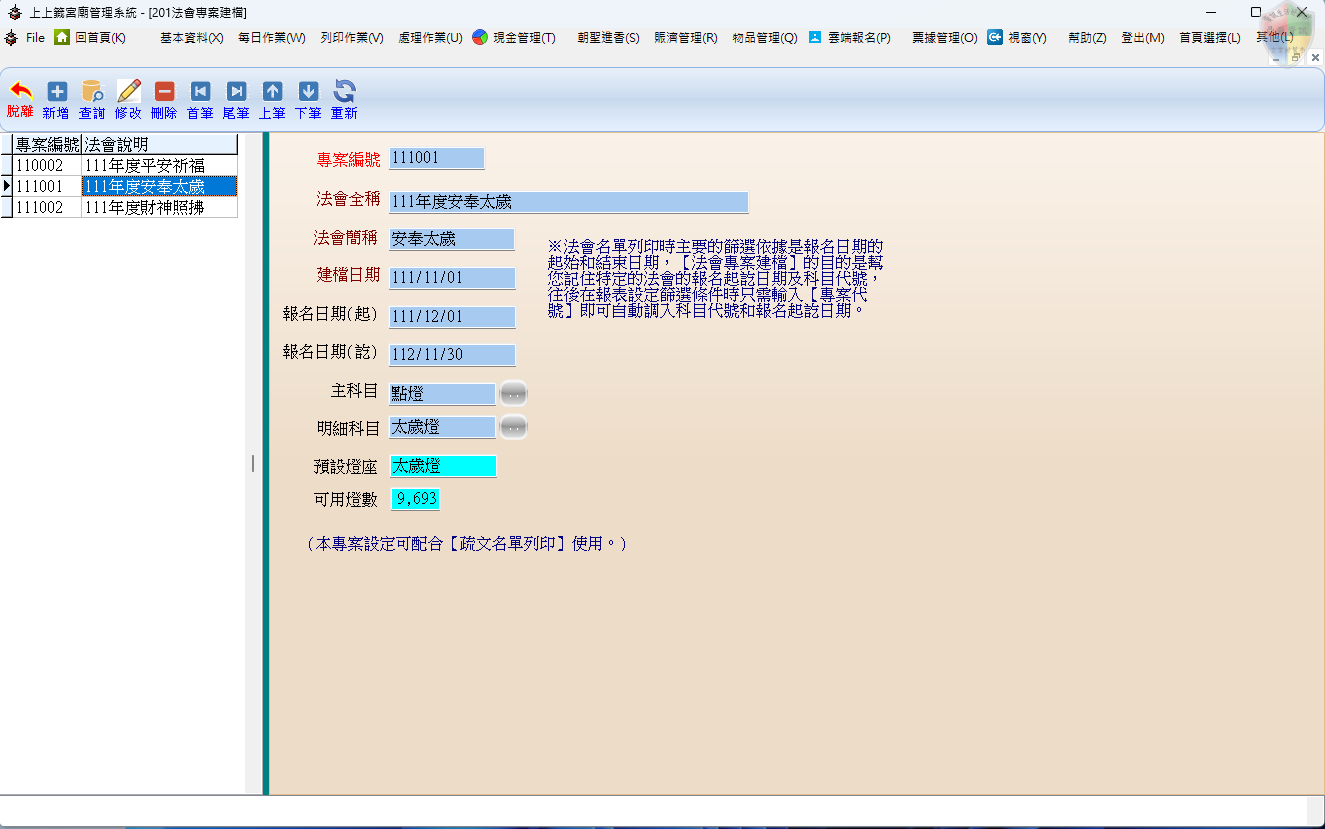 專案維護與廢止: 若法會名稱有誤或日期微調,請先執行「查詢」叫出專案,按下「修改」後更新。