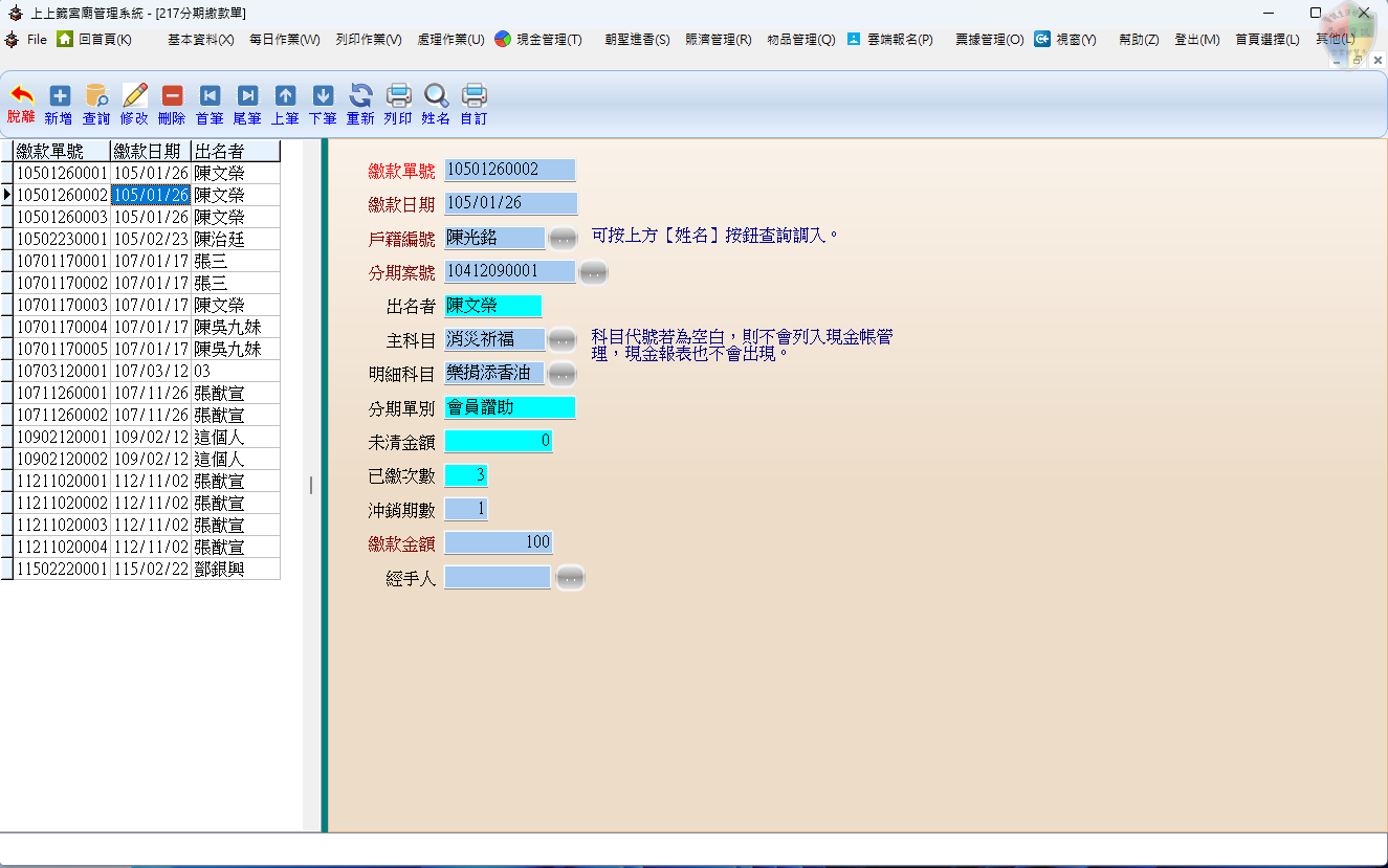 姓名查詢功能: 若不清楚戶籍編號,可利用功能列的「姓名」查詢按鈕,系統會列出該信眾名下所有的分期紀錄供選取。