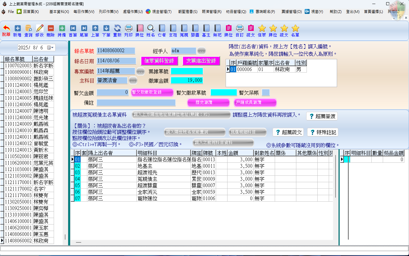 此區塊為法會的核心,負責記錄每一筆超薦細節。